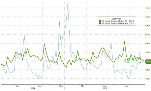 此外,上周美国首次申请失业救济人数下降至22万,显示尽管经济存在不确定性,雇主整体仍在保留现有员工。截至11月15日当周,初请人数减少8,000人。根据劳工部周四发布的数据,上周续请失业救济的人数上升至197万人。尽管近期包括亚马逊和Target在内的多家大型企业宣布裁员,但失业金申请人数迄今仍相对温和。四周均值也略有下降至224,250人。这份报告也是自美国联邦政府因停摆而暂停数据报告长达 43 天之后,首次发布的关于全国范围内的失业金情况的官方报告。